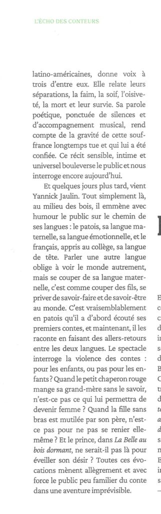« un très bon moment rempli d’émotion. Des récits profonds et légers. Bravo. et la musique avec les chants ont apporté une valeur supplémentaire. Longue vie à ce beau projet. » Hortense